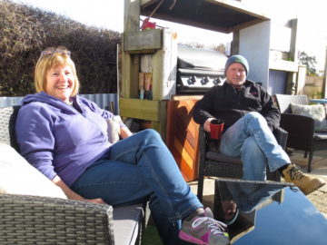 Marion Whyte & Paul Dayman in their courtyard at Tahuna Beach Holiday Park
